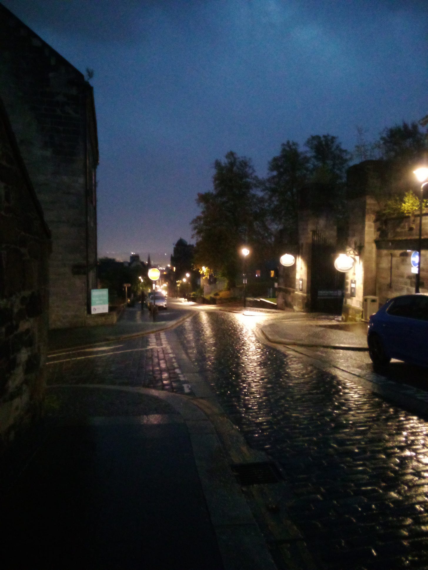 An overripe-black sky grazed by serrated stone rooftops. Rain falls thick, cold, slick. The light of warm lamps and blue neon signs run down the cobbled streets and pool in the gutters. I trek up, up, up the hill, toward Stirling Castle.