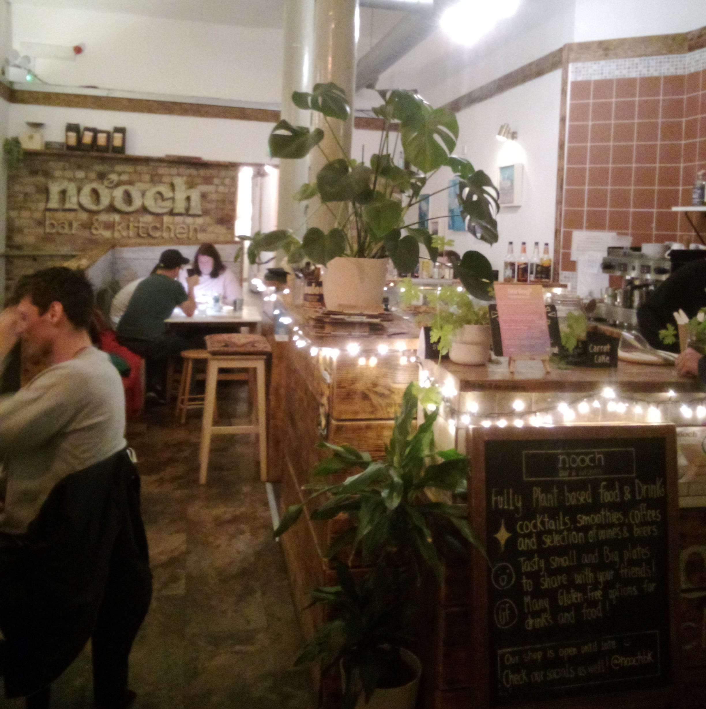 Cozy little vegan place, open till late. A haunt of George and Elsa’s. I join my three friends in a cozy booth towards the back— and there is much rejoicing. The feeling returns to my fingers. Again I am thrilled by the delicious creativity going into vegan food. Bean burger, crisps, then a raspberry cheesecake. Delightfully tart.